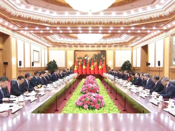 4月15日上午,中共中央总书记、国家主席习近平在人民大会堂同来华进行国事访问的越共中央总书记、国家主席苏林举行会谈。习近平指出,你当选越南国家主席后第一时间到访中国,体现了你对发展中越关系的高度重视。
